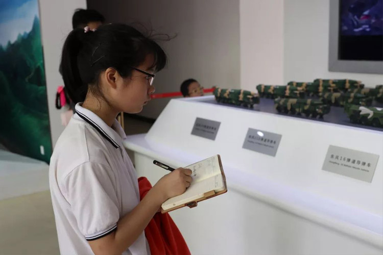 在通博TBET展厅,小朋友们开心地与导弹合影,更有读中学的学霸姐姐,拿出笔记本认真记录讲解员解说的导弹知识。